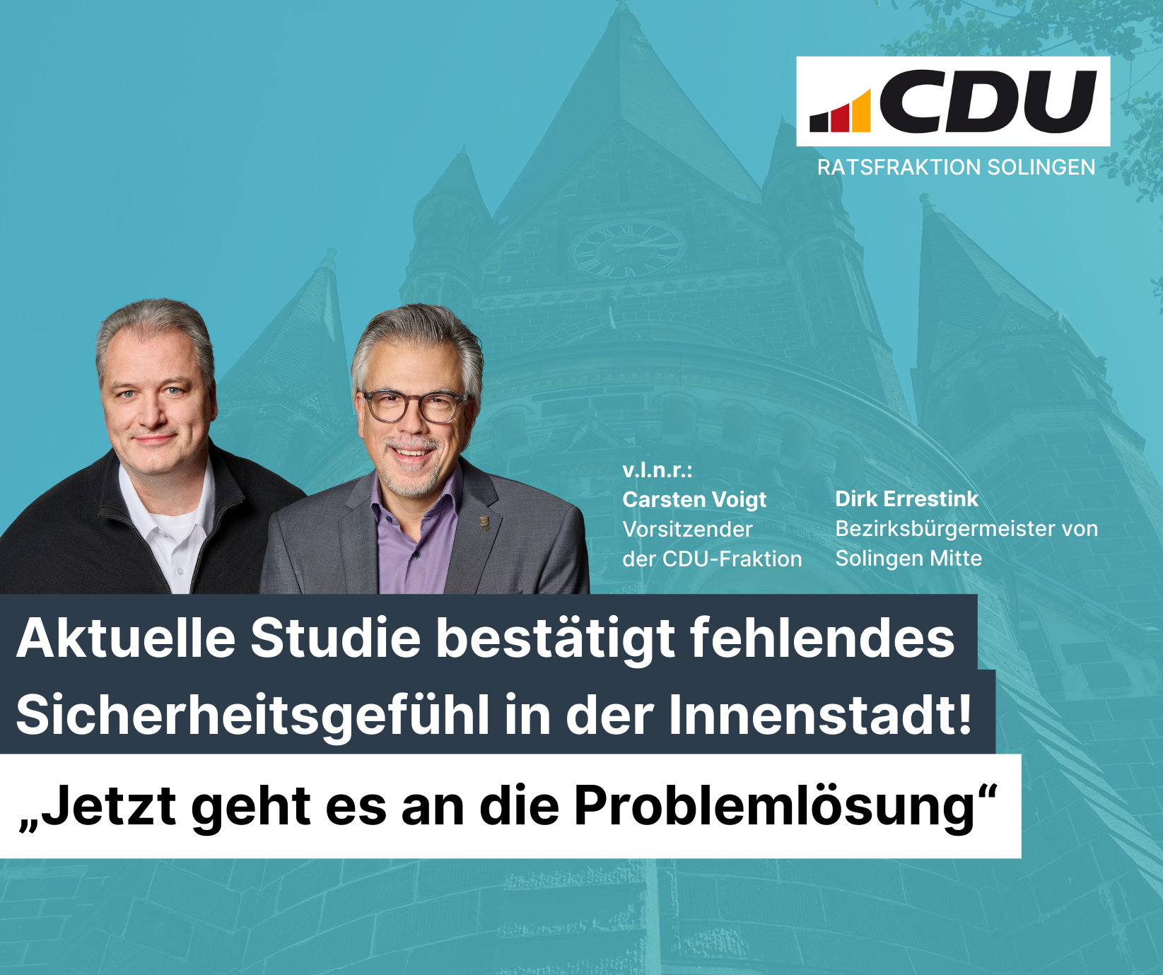 „Wir richten den Blick aber nach vorn. Jetzt ist klar: Es geht nicht mehr darum, wer in puncto der Sicherheitslage in der Solinger Innenstadt Recht hat oder nicht. Die nun veröffentlichen Zahlen untermauern die Argumentation der CDU-Fraktion. Jetzt kann es nicht mehr darum gehen, Probleme bloß zu beschreiben, sondern zu lösen. Es ist ein erster guter Schritt, dass Oberbürgermeister Daniel Flemm die Studie am gestrigen Tag allen Fraktionsvorsitzenden und ‑geschäftsstellen zur Verfügung gestellt hat. Auch die Presse wird zeitnah informiert. Diese transparente Informationspolitik begrüßen wir. Der Oberbürgermeister hält hier alle Fraktionen gleich und informiert transparent. Als CDU-Fraktion werden wir diese Studie nun intensiv beraten. In den zuständigen Gremien wird es dann darum gehen, dass wir gemeinsam an Lösungen arbeiten“, so der CDU-Fraktionsvorsitzende Carsten Voigt.