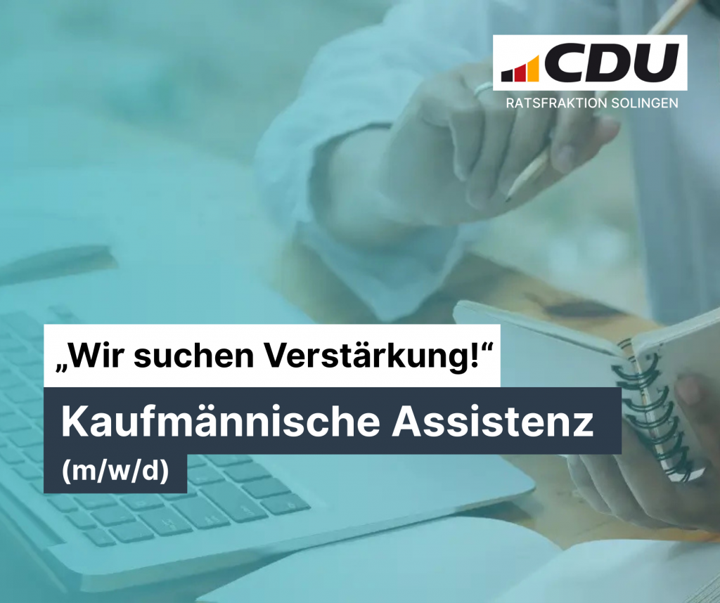 Die CDU-Fraktion im Rat der Stadt Solingen sucht zur Verstärkung ihres Teams in der Geschäftsstelle eine kaufmännische Assistenz (m/w/d) in Teilzeit (ca. 20 Stunden pro Woche).