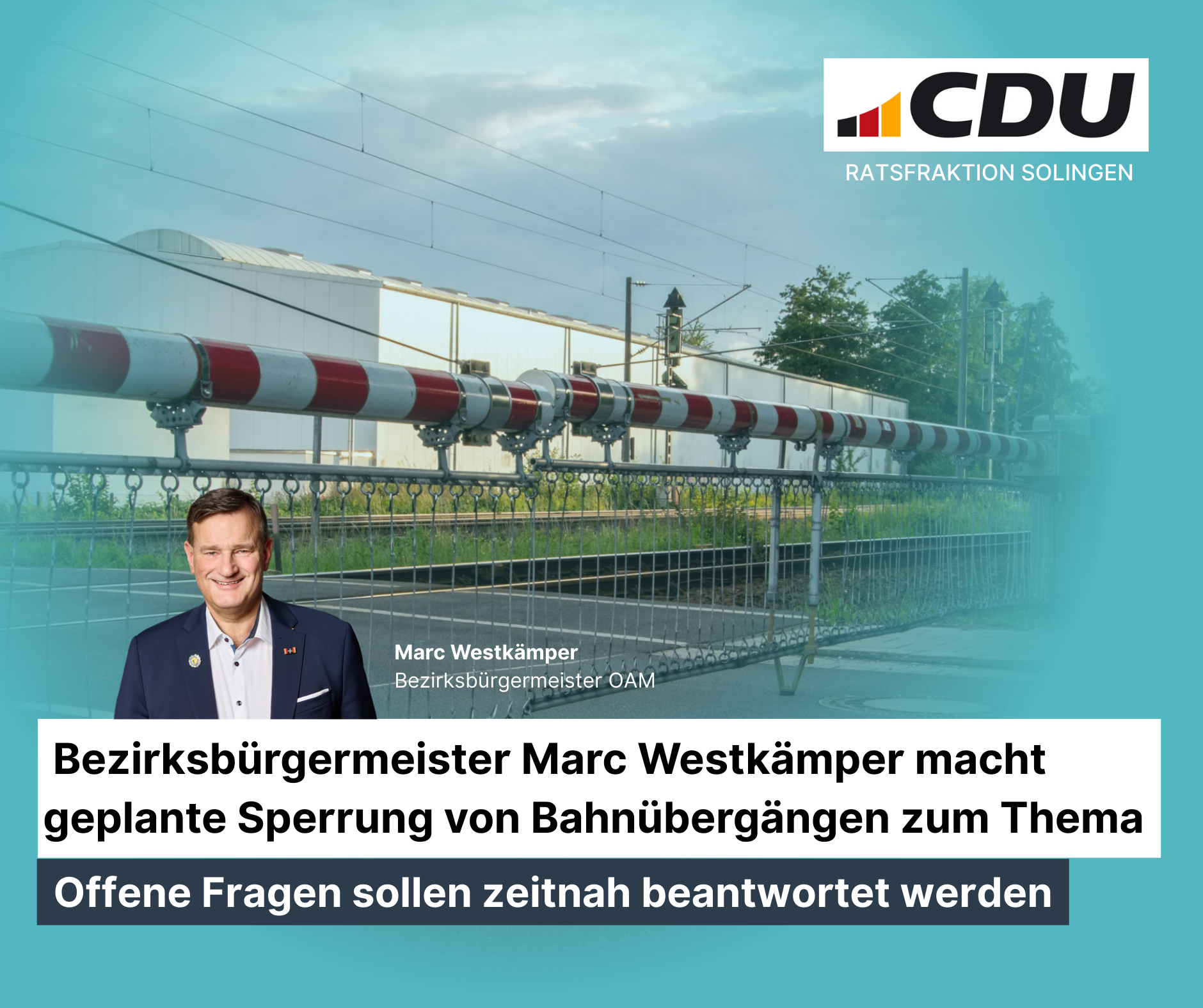 „Ich finde es richtig, dass offene Fragen zur geplanten Sperrung der Bahnübergänge Schnittert und Wilzhauser Weg gestellt und beantwortet werden. Ich werde das Thema in der Sitzung der Bezirksvertretung Ohligs/Aufderhöhe/Merscheid (BV OAM) am kommenden Montag zur Sprache bringen. Die SPD hat dazu ja drei Fragen formuliert. Die eher in die Vergangenheit gerichteten Fragen werden für die von der Sperrung betroffenen Bürgerinnen und Bürger nicht so wichtig sein. Wichtiger sind die voraussichtlichen Auswirkungen der Maßnahmen. Dazu werden wir in der Sitzung der BV auch noch die eine oder andere Frage stellen. Als Bezirksbürgermeister bin ich gern dazu bereit, dass wir als BV zeitnah reagieren und zumindest zur Beantwortung offener Fragen durch die Verwaltung beitragen können“, sagt der Bezirksbürgermeister von OAM, Marc Westkämper.