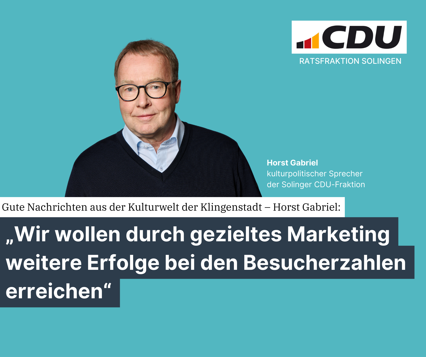 „Es ist beruhigend, dass der negative Corona-Trend offenbar der Vergangenheit angehört. Kultur ist mehr als ein Sahnehäubchen und gehört zur kommunalen Daseinsvorsorge, da Kultur unsere Gesellschaft zusammenhält, Identität stärkt und uns immer wieder zum Nachdenken anregt – und auch unterhält, denn sonst bleiben die Zuschauer aus. Die CDU-Fraktion freut sich über den Erfolg, dankt allen, die diesen Erfolg möglich gemacht haben. Dies gibt Anlass zur Hoffnung, durch ein gezieltes und koordiniertes Marketing noch weitere Verbesserungen zu erzielen, und es ist unsere Pflicht, einen zukunftsfähigen Ort für unsere tollen Kulturprogramme sicher zu stellen. Unser städtisches Kulturangebot ist in erster Linie für die Menschen in Solingen und aus der Region da. Und die waren offensichtlich angetan davon, dass Wünsche des Publikums bei der Programmgestaltung berücksichtigt wurden“, so Gabriel abschließend.