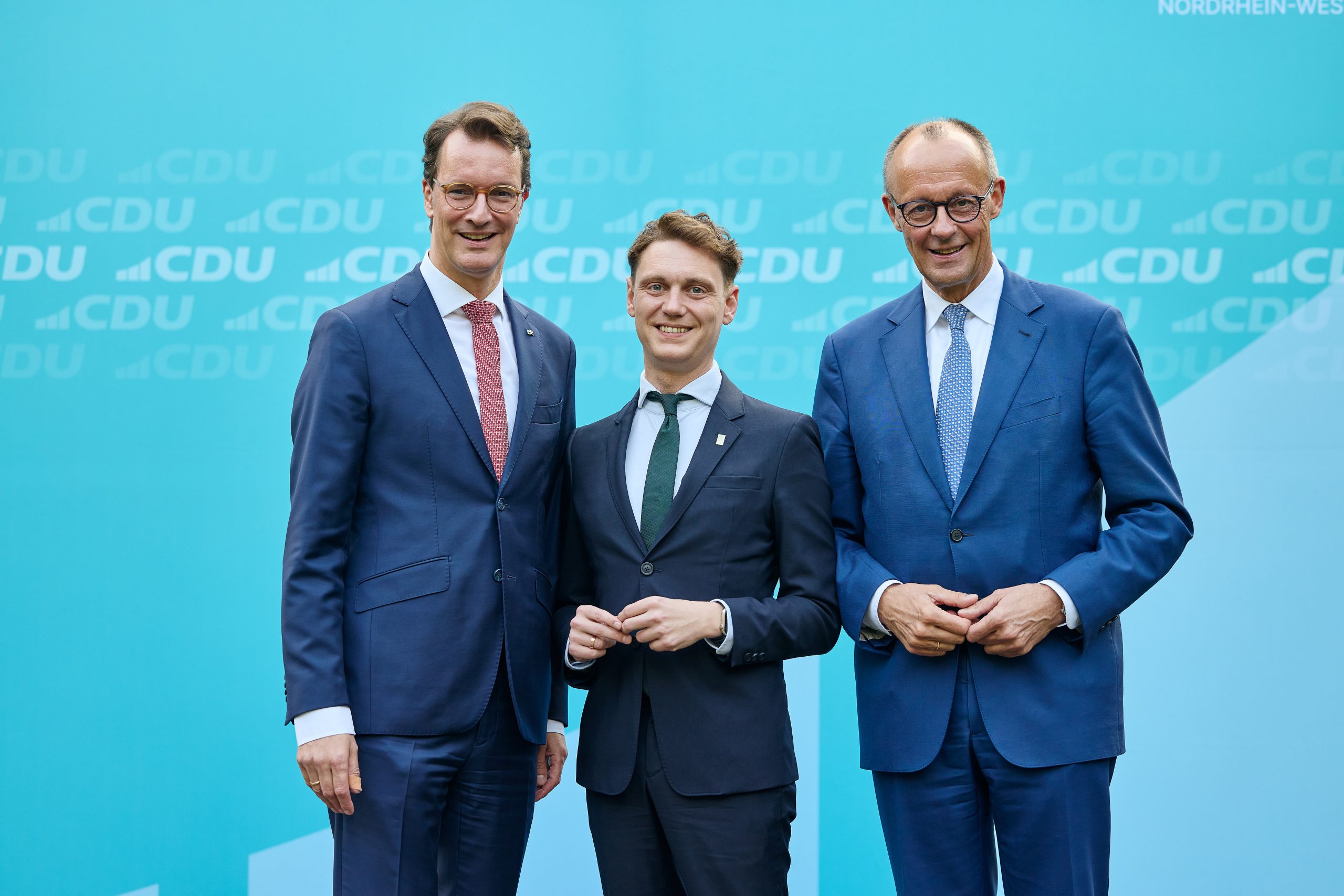 Der frisch gewählte Solinger Oberbürgermeister Daniel Flemm wurde gemeinsam mit weiteren neu gewählten kommunalen Spitzenvertretern auf Einladung von Ministerpräsident Hendrik Wüst in die CDU-Landesgeschäftsstelle Düsseldorf empfangen. Bundeskanzler Friedrich Merz ließ es sich nicht nehmen, gemeinsam mit Wüst den erfolgreichen Wahlkampf und den klaren Wahlsieg der CDU in Solingen öffentlich zu würdigen.